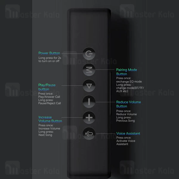 بر روی قسمت بالای اسپیکر Baseus V1 کنترل پنلی با 6 دکمه برای روشن خاموش، تنظیم صدا و موسیقی تعبیه شده که کارای آن به شرح زیر است: