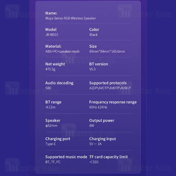اسپیکر Joyroom JR-MS01 یک اسپیکر قابل حمل بلوتوثی بوده که توان آن 8 وات است؛ نورپردازی لیزری دارد و با استفاده از حافظه micro SD و بلوتوث 5.1 می توانید به پخش موسیقی بپردازید.
