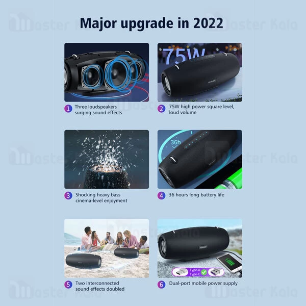 یکی از نکات و قابلیت های مهم این اسپیکر، قابلیت پاور بانک داشته و شما می توانید با استفاده از درگاه تایپ سی و USB دستگاه های خود را شارژ کنید. شارژ دستگاه شما باعث قطع شدن موزیک نخواهد شد.