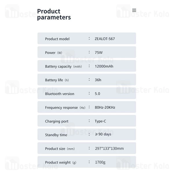 توان کلی اسپیکر Zealot S-67 برابر با 75 وات بوده که باعث صدای بلند با کیفیت بالا و در حجم بالا می شود.