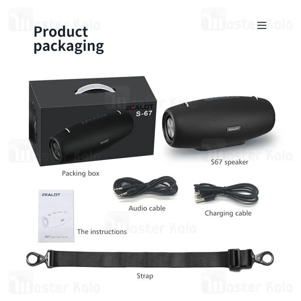 در بسته بندی اسپیکر Zealot S-67 علاوه بر خود اسپیکر، یک عدد بند، یک عدد کابل AUX، یک عدد کابل شارژ تایپ سی و دفترچه راهنما وجود دارد.