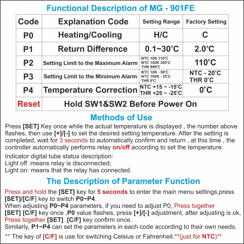 ترموستات دیجیتال MG–901FE با سنسور ترموکوپل قادر به اندازهگیری دما از 0 تا 999 درجه سانتیگراد است با دقت بالای ± 0.1 درجه سانتیگراد می باشد. ولتاژ کاری آن 12 ولت DC است و سیم سنسور طول 50 سانتیمتر دارد. عدد دمای لحظهای در سمت پایین نمایشگر و دمای تحریک در سمت بالای آن نمایش داده میشود، که به صورت پیشفرض بر روی 30 درجه تنظیم شده است. تنظیمات ترموستات از طریق کلیدهای set، + و – انجام میشود، و میتوان مقدار آلارم و کالیبراسیون دما را نیز تنظیم کرد.