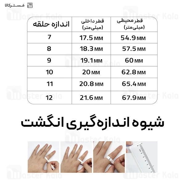 برای پیدا کردن سایز انگشت خود میتوانید به عکس سوم گالری مراجعه کنید. برای اینکار یک نخ را دور انگشت خود پیچیده و سپس اندازه آن را با یک خط کش اندازه گیری نمایید و نزدیک ترین سایز مناسب را انتخاب نمایید.