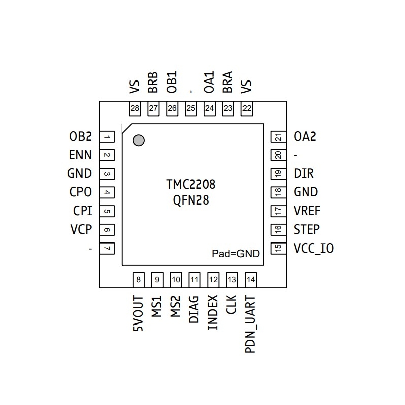 درایور TMC2208 یک چیپ فوقالعاده کمصدا برای کنترل استپر موتورهای دو فاز است که با جریان پیوسته 1.4A و جریان پیک 2A در محدوده ولتاژ 4.75V تا 36V کار میکند. این درایور دارای 256 میکروپله بوده و با استفاده از واحد MicroPlyer، کنترل سینوسی دقیق را حتی در سیستمهایی با فرکانس پالس محدود امکانپذیر میسازد.