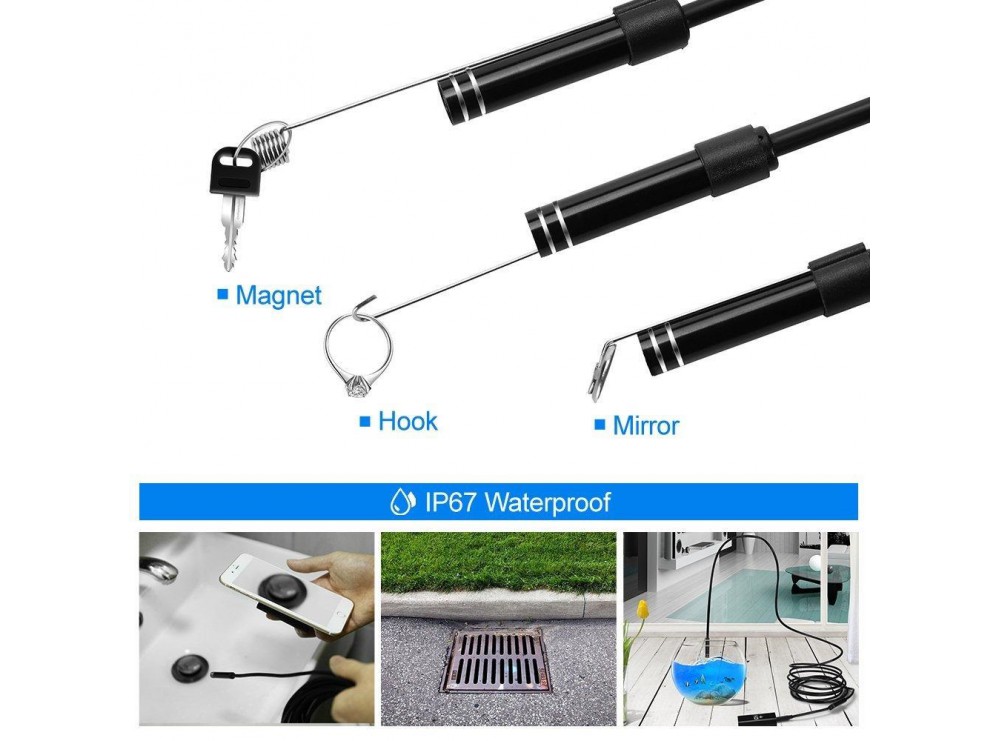 دوربین اندوسکوپی ضدآب (استاندارد IP67) از نوع سیم فنری با قطر لنز 7mm و رزولیشن 480×640 یک دوربین بروسکوپ (سیمی حفره بین) چراغدار با 6 عدد LED و دوربین 1.3 مگا پیکسلی میباشد که در تعمیرات تجهیزات نصب شده و یا با دسترسی سخت توسط دوربین اندوسکوپی کابل دار می توانید جاهایی که دسترسی به آن ها میسر نیست را در موبایل ، تبلت یا لپ تاپ خود مشاهد کنید. با استفاده از این دوربین امکان مشاهده حفره ها و سوراخ ها و امکان تصویری برداری از مکان های دور از دسترس را خواهید داشت. محصول فوق همچنین دارای گیره های مختلف برای خارج کردن اجسام از جاهایی که دسترسی امکان پذیر نیست و نیاز به نور برای تعیین محل شی مورد نظر دارد قابل استفاده است.