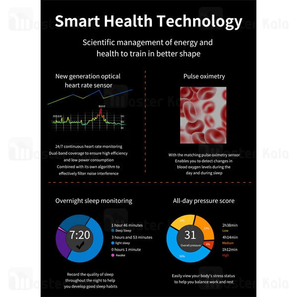 اندازهگیری سطح اکسیژن خون و فشار خون: با این قابلیت فشار خون و میزان SpO2 خونتان را اندازهگیری کنید و بدین ترتیب همواره شرایط جسمانی خودتان را تحت نظر داشته باشید؛ که هنگام انجام فعالیتهای سنگین میتواند کاربرد بالایی داشته باشد. همچنین اگر در شرایط غیر از خواب سطح اکسیژن خون پایینی داشته باشید و یا فشار خون غیر طبیعی داشته باشید؛ به شما هشدار داده می شود.