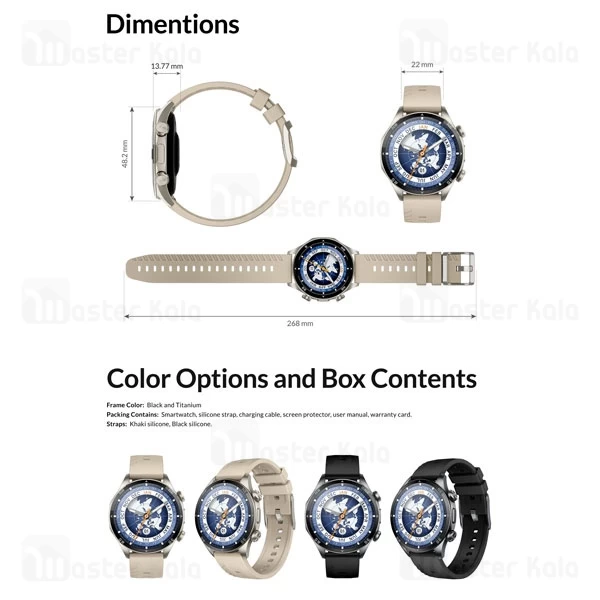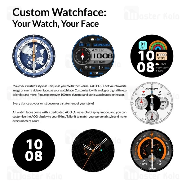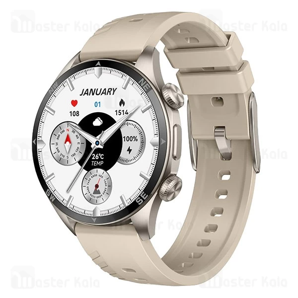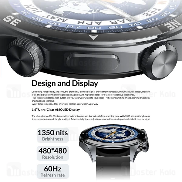 صفحه AMOLED با اندازه 1.32 اینچ و وضوح 480×480، رنگهای زنده و کنتراست بالا ارائه میدهد. طراحی منحنی شیشه و فریم فلزی، ظاهری شیک و مدرن به ساعت میبخشد. با روشنایی 1350 نیت و نرخ تازهسازی 60 هرتز، تجربه بصری بسیار واضح و جذاب خواهید داشت.