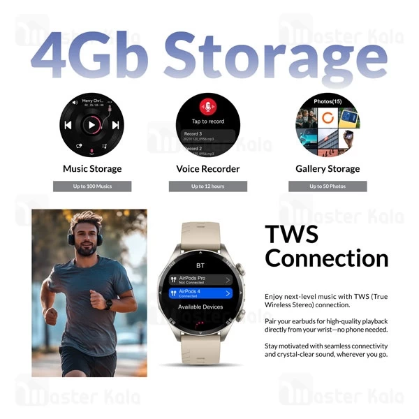 این ساعت با حافظه داخلی 4 گیگابایتی امکان ذخیره موسیقی و فایلهای صوتی را فراهم میکند. میتوانید موسیقی مورد علاقه خود را ذخیره کرده و بدون نیاز به گوشی از آن لذت ببرید. همچنین امکان ضبط صدا و ذخیره عکسها وجود دارد تا تجربهای چندجانبه و سرگرمکننده از ساعت هوشمند داشته باشید.