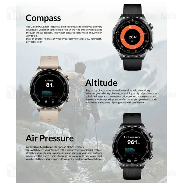 ساعت هوشمند گلوریمی Glorimi GX Sport تغییرات فشار هوا را به صورت لحظهای نمایش میدهد و شما را برای شرایط جوی آماده میکند. با این ویژگی میتوانید قبل از شروع فعالیتهای خارج از خانه، وضعیت هوا را پیشبینی کنید و تصمیمهای مناسبی برای سفر یا تمرینات ورزشی خود بگیرید. این قابلیت به شما کمک میکند ایمنتر و هوشمندانهتر در محیطهای طبیعی حرکت کنید و تجربهای مطمئن از ماجراجویی داشته باشید.