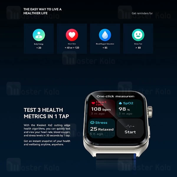با الگوریتم سلامتی پیشرفته Kieslect Ks2، میتوانید به سرعت ضربان قلب، سطح اکسیژن خون و استرس خود را تنها با یک کلیک در 30 ثانیه پایش و نتیجه را مشاهده کنید و فوراً وضعیت سلامتی خود را در هر زمان و هر مکان بدانید.