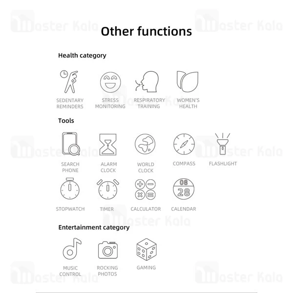 دیگر امکانات مرتبط با سلامتی: قدمشمار، کنترل فشار خون، تست استرس، و همچنین شمارشگر و تمرین تنفس از جمله دیگر ویژگیهای این ساعت هستند که میتوانند به حفظ سلامت شما کمک شایان توجهی کنند.