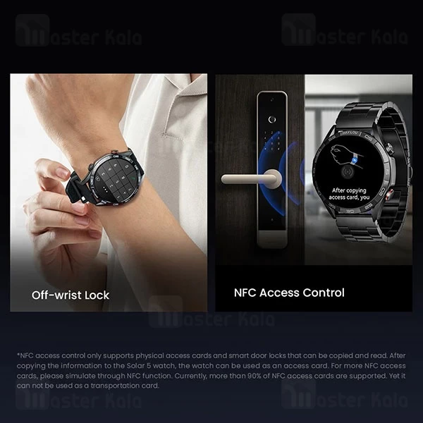 ساعت هوشمند هایلو Solar 5 از کنترل دسترسی NFC و عملکردهای صفحه قفل خارج از مچ پشتیبانی می کند. فقط روی کارت دسترسی روی ساعت ضربه بزنید تا درب به سرعت باز شود. ویژگی قفل هوشمند خارج از مچ به طور خودکار زمانی که شما ساعت را نمی پوشید تشخیص می دهد و صفحه نمایش را قفل می کند و همیشه از حریم خصوصی شما محافظت می کند.