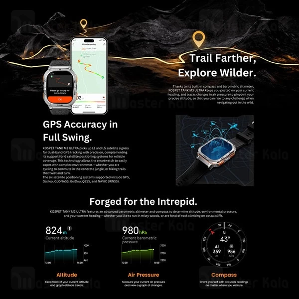 دوچرخه سواران، کوهنوردان و کاوشگران از همه نوع می توانند از موقعیت یابی دو باند KOSPET TANK M3 Ultra و سیستم موقعیت یابی 6 ماهواره ای آن استفاده نمایند. این ساعت هوشمند با داشتن قطب نما و ارتفاع سنج و فشارسنج داخلی می تواند سمت حرکت، ارتفاع و فشار هوای فعلی شما را تعیین کند.