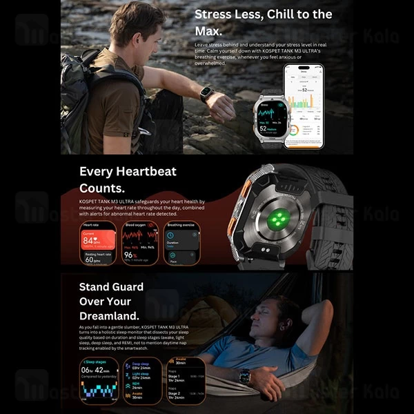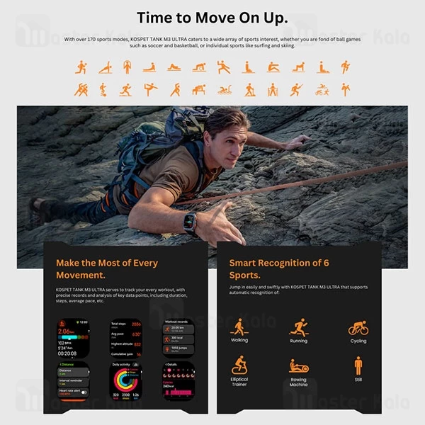 ساعت KOSPET TANK M3 Ultra بیش از 170 حالت ورزشی، تمرینات در فضای باز شما را با نقشه برداری دقیق مسیر و اندازه گیری مسافت، سرعت متوسط، کالری سوزانده شده و سایر داده های ورزشی موجود در برنامه سازگار KOSPET FIT ردیابی می کند، به طوری که ساعت هوشمند شما می تواند شما را به سمت اهداف تمرینی خود سوق دهد.