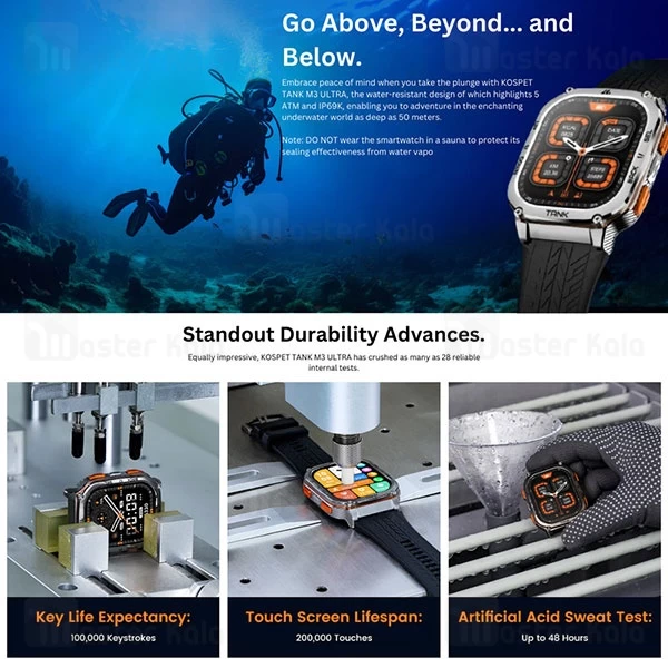 این ساعت هوشمند IP69K پویا ضد آب و ضد آب استاتیک، تا 50 متر ساعت TANK M3 Ultra آزمایشهای مقاومت IP69K را پشت سر گذاشته است، به طوری که می توانید آن را در مورد تمام ورزش ها و فعالیت های آبی روزانه مانند شنا، غواصی، موج سواری و غیره استفاده کنید. استاندارد مقاومتی 5ATM ساعت KOSPET Tank M3 Ultra، به این معنی بوده که این ساعت می تواند فشار آب تا عمق 50 متر را تحمل کند.