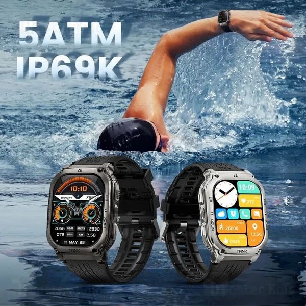 این ساعت هوشمند IP69K پویا ضد آب و ضد آب استاتیک، تا 50 متر ساعت TANK M3 آزمایشهای مقاومت IP69K را پشت سر گذاشته است، به طوری که می توانید آن را در مورد تمام ورزش ها و فعالیت های آبی روزانه مانند شنا، غواصی، موج سواری و غیره استفاده کنید. استاندارد مقاومتی 5ATM ساعت KOSPET Tank M3، به این معنی بوده که این ساعت می تواند فشار آب تا عمق 50 متر را تحمل کند.