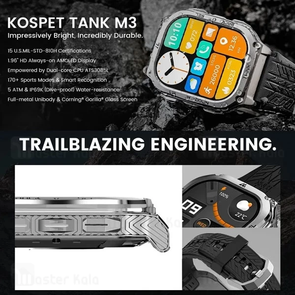 ساعت KOSPET TANK M3 نهایت کیفیتی را که می خواهید، از بدنه ساخته شده با فولاد ضد زنگ عالی و ریز جلا گرفته تا شیشه Corning Gorilla Glass 3 بسیار مقاوم در برابر آسیب که صفحه نمایش آن را می سازد، به شما ارائه می دهد.