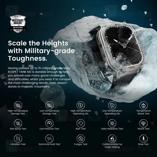 طراحی و انتخاب مواد مورد استفاده برای ساخت ساعت کازپت TANK M3بر اساس گواهی نامه MIL-STD-810H ارتش ایالات متحده انجام شده است. همچنین با بررسی و انجام بیش از 12 تست و آزمایش ساعت KOSPET Tank M3 ثابت کرده است که برای هر فعالیت در فضای باز و شرایط سخت قابل استفاده است و به شما کمک می کند تا با چالش های سخت روبرو شوید.