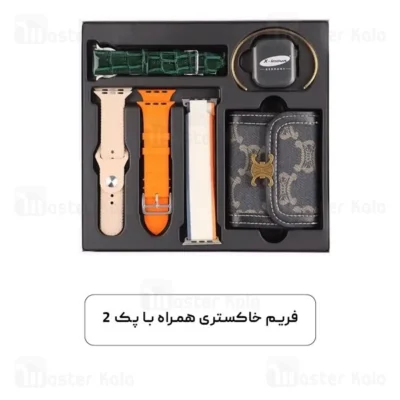 در بسته بندی ساعت HK98 Pro Plus علاوه بر ساعت، 4 بند شامل 2 بند سیلیکونی، یک بند چرمی و یک بند پارچه ای، یک کابل شارژ مگنتی، یک مچ بند فلزی شیک، یک کیف کارتی و دفترچه راهنما وجود دارد.