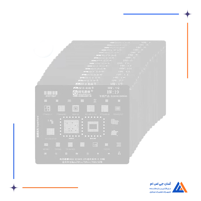 ست شابلون AMAOE HW 1/19 ، ابزارهای حرفهای برای ریبال و تعمیرات دقیق چیپهای CPU، RAM و ICهای وایفای در گوشیهای هواوی هستند. این شابلونها با طراحی دقیق و کیفیت بالا، انتخابی ایدهآل برای تعمیرکاران حرفهای و علاقهمندان به تعمیرات موبایل میباشند.