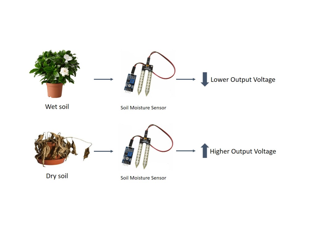 همانطور که از نام این سنسور مشخص است ، برای اندازه گیری میزان رطوبت و یا آب موجود در خاک و زمین استفاده می گردد با استفاده از این سنسور ، برد آردوینو ، یک رله و یک پمپ آب ساده همه چیز برای ساخت یک سیستم آبیاری هوشمند برای گلدان منزلتان فراهم است، از این پس در زمان مسافرت دیگر نگران آبیاری گلدان های منزلتان نباشید ، چون شما یک سیستم آبیاری هوشمند آردوینو را ساخته اید ! برای نحوه ساخت این سیستم می توانید به انجمن های آردوینو مراجعه نمایید. این سنسور در اصل میزان تشنگی گیاه شما را مشخص می نماید، خروجی آنالوگ این سنسور در زمانی که میزان رطوبت خاک کم باشد ، مقدار خروجی بالا و زمانی که رطوبت بالا باشد مقدار پایین تری را به پین آنالوگ آردوینو ارسال می نماید.
