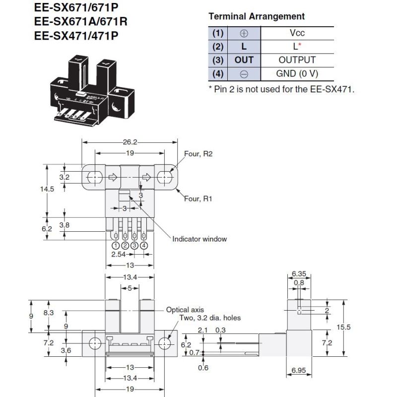 EE-SX671 جزو گروه سنسورهای فتو اینتراپتر اسلاتی طبقه بندی می گردد.EE-SX671 یک سنسور با فاصله تشخیصی 5 میلی متر بوده و روش تشخیص آن از نوع انتقال و پیکربندی خروجی آن به صورت NPN – Open Collector می باشد. روش نصب آن به صورت شاسی و ولتاژ و جریان تغذیه آن به ترتیب 5 ولت تا 24 ولت و 12 میلی آمپر می باشد. زمان پاسخ 1 میلی ثانیه ، بازه دمایی در رنج منفی 25 درجه سانتیگراد الی 55 درجه سانتیگراد می باشد. پکیج این سنسور Module, Connector, Slot Type است.