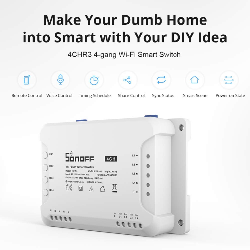 با استفاده از رله سوئیچ چهار کانال Sonoff 4CH R3 می توانید وضعیت وسایل خانگی خود را در هر زمان و هرکجایی که هستید چک کنید و تنها با یک کلیک روی گوشی هوشمند یا تبلت، آنها را خاموش و روشن کنید. لازم به ذکر است که هیچ محدودیتی در میزان فاصله وجود ندارد. علاوه بر این می توانید تایمرهای شمارش معکوس را تنظیم کنید تا در زمان تعیین شده، وسائل شما خاموش و روشن شوند. شما می توانید از این رله سوئیچ برای مدیریت سیستم های روشنایی و کلیه مصرف کننده های برقی تا حداکثر جریان مجموع 16 آمپر و برای تک کانال تا حداکثر جریان 10 آمپر استفاده کنید.