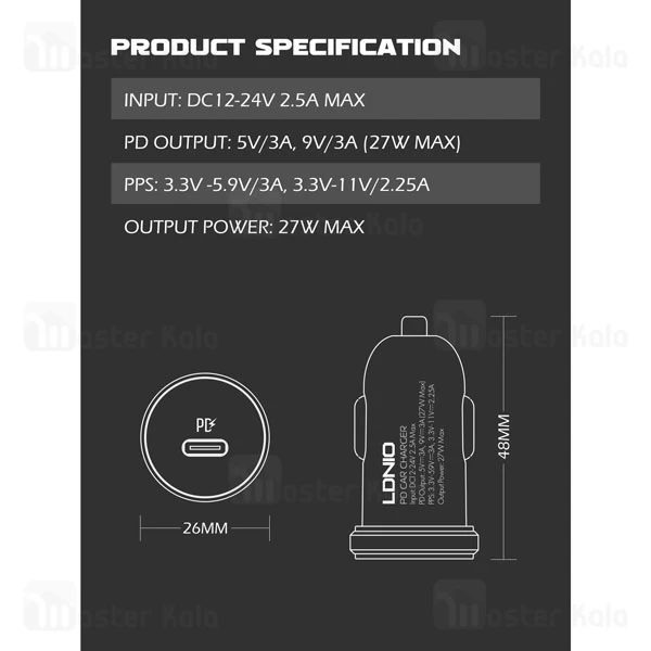 شارژر فندکی الدینیو Ldnio C22Q توان 27 وات همراه با کابل