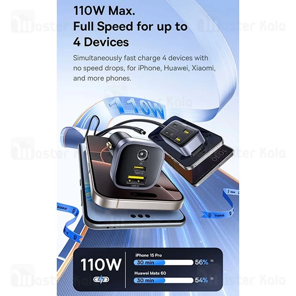 مهمترین ویژگی شارژر فندکی C00081100121 بیسوس، توان خروجی کلی 110 وات است که قدرت کافی برای شارژ همزمان چند دستگاه را بدون افت سرعت فراهم میکند. هر کدام از پورتهای Type-C1، Type-C2 و USB-A1 توان 30 وات را پشتیبانی میکنند، در حالی که Type-C3 و دو پورت USB دیگر، تا 20 وات خروجی دارند. با این سطح توان، میتوانید گوشیهای هوشمند، تبلت، دوربین و سایر گجتهای الکترونیکی را در مدتزمان کوتاهی شارژ کنید. پشتیبانی از انواع پروتکلهای شارژ سریع مانند Quick Charge و Power Delivery نیز باعث شده که این شارژر با اکثر دستگاهها سازگاری کامل داشته باشد.