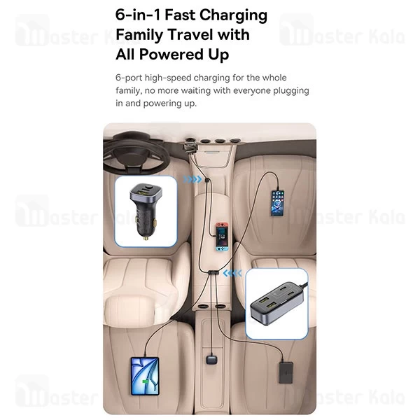Baseus BackseatPal L1 دارای 6 پورت خروجی شامل 3 پورت USB-A و 3 پورت Type-C است که بهراحتی میتوانید چند دستگاه را بهطور همزمان شارژ کنید. این تنوع پورت باعث میشود تا اعضای خانواده یا مسافران در یک خودرو بتوانند گوشی، تبلت، کنسول بازی یا حتی جاروبرقی خودرو و دستگاه تصفیه هوا را به راحتی شارژ کنند. دیگر لازم نیست نگران جا ماندن شارژر یا کمبود پریز در خودرو باشید.