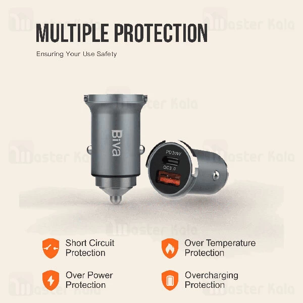 شارژر فندکی بیوا CC-07Q+C دارای محافظت در برابر گرمای بیش از حد، اتصال کوتاه، اضافه ولتاژ، اضافه جریان و کاهش ولتاژ است.