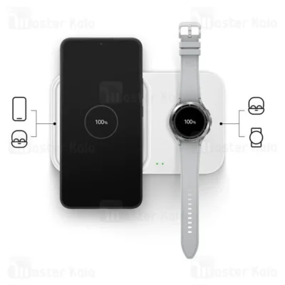 شارژر وایرلس Samsung Duo دارای دو پد برای شارژ وایرلس می باشد؛ که پد سمت راست برای شارژ ساعت و هندزفری بوده و پد سمت چپ برای گوشی و هندزفری خواهد بود.