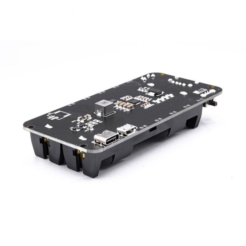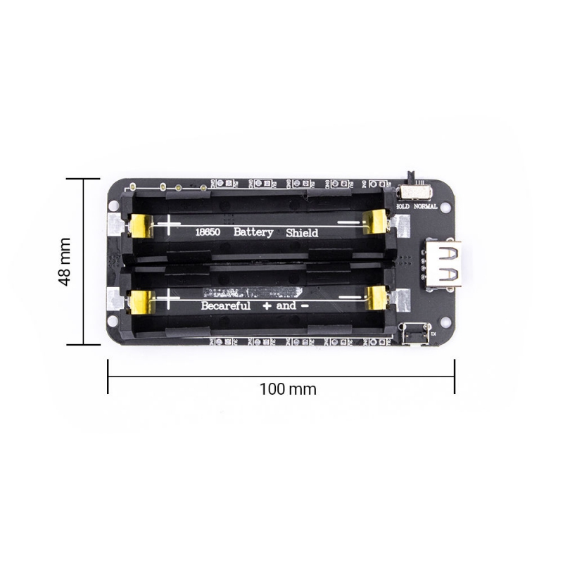 این شیلد باتری برای استفاده از دو سلول لیتیومیون 18650 بهصورت موازی طراحی شده و به کمک مدار داخلی مبدل DC-DC، خروجی 5 ولت پایدار با جریان نامی 2.2 آمپر و حداکثر 3 آمپر ارائه میدهد. ماژول مجهز به تراشه حفاظت باتری لیتیوم است که عملکردهایی مانند جلوگیری از اضافهجریان، اضافهولتاژ و کمولتاژ را فراهم میکند. ورودی شارژ از طریق پورتهای MicroUSB و Type-C انجام میشود و چهار LED نشانگر میزان شارژ باتری را نمایش میدهند (قرمز: در حال شارژ، سبز: شارژ کامل). این برد بهطور پیشفرض در حالت کاری دائمی قرار دارد و در صورت نیاز میتوان آن را به حالت خاموش خودکار تغییر داد. توجه شود که باتریها باید بهصورت صحیح و با رعایت قطبیت نصب شوند و این برد برای شارژ مستقیم تلفن همراه طراحی نشده است.