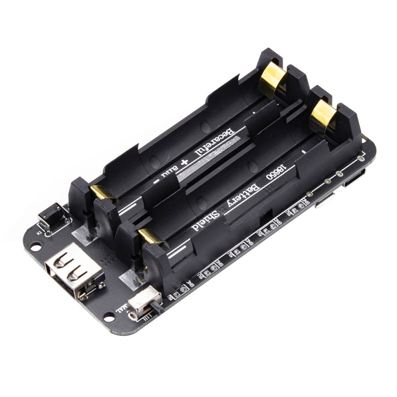 این شیلد باتری برای استفاده از دو سلول لیتیومیون 18650 بهصورت موازی طراحی شده و به کمک مدار داخلی مبدل DC-DC، خروجی 5 ولت پایدار با جریان نامی 2.2 آمپر و حداکثر 3 آمپر ارائه میدهد. ماژول مجهز به تراشه حفاظت باتری لیتیوم است که عملکردهایی مانند جلوگیری از اضافهجریان، اضافهولتاژ و کمولتاژ را فراهم میکند. ورودی شارژ از طریق پورتهای MicroUSB و Type-C انجام میشود و چهار LED نشانگر میزان شارژ باتری را نمایش میدهند (قرمز: در حال شارژ، سبز: شارژ کامل). این برد بهطور پیشفرض در حالت کاری دائمی قرار دارد و در صورت نیاز میتوان آن را به حالت خاموش خودکار تغییر داد. توجه شود که باتریها باید بهصورت صحیح و با رعایت قطبیت نصب شوند و این برد برای شارژ مستقیم تلفن همراه طراحی نشده است.