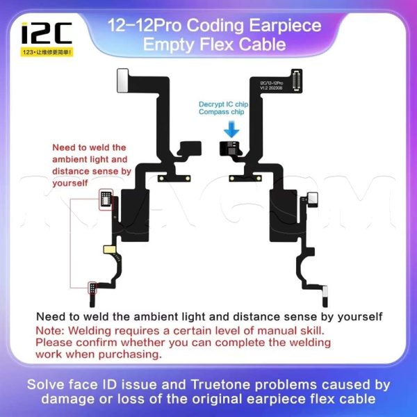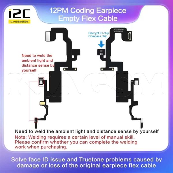 فلت رسیور خام Empty Receiver FPC آیفون برند i2C جهت حل مشکل فیس آیدی و True Tone که براثر پاره شدن فلت اصلی پیش میآید، با این فلت میتوانید بدون نیاز به آنبایند و تنها با سواپ سنسورهای فلت قبلی به فلت خام، مشکل را رفع نمایید.