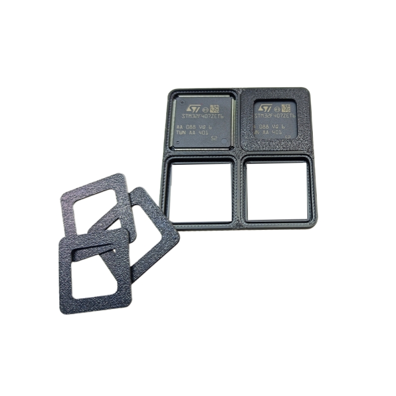 این قاب محافظ آیسی با استفاده از پرینتر 3 بعدی چاپ شده است که مناسب قرار دادن 4 عدد IC پکیج QFP144 می باشد. همچنین می توانید پس از قرار دادن IC درب آن را بسته تا داخل قاب چفت شود.