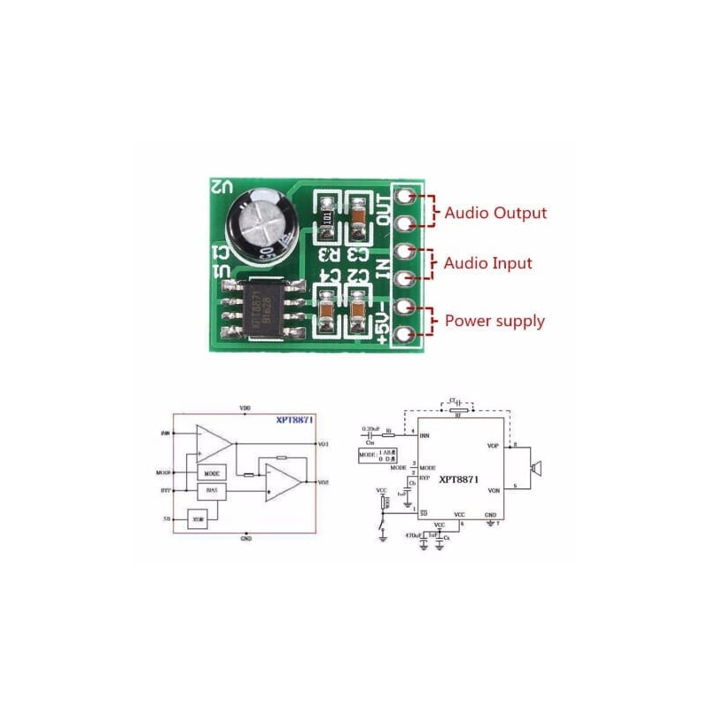 ماژول آمپلی فایر تک کاناله 6 وات مدل XPT8871 یک ماژول آمپلی فایر کوچک ولی پرکاربرد دارای یک کانال با توان 6 وات که در آن از تراشه XPT8871 بهره برده است. مناسب برای سیستم های صوتی کوچک، کم مصرف و قابل حمل و سایر سیستم های صوتی دیگر که دارای بلندگوهای 4اهم و 8اهم هستند.