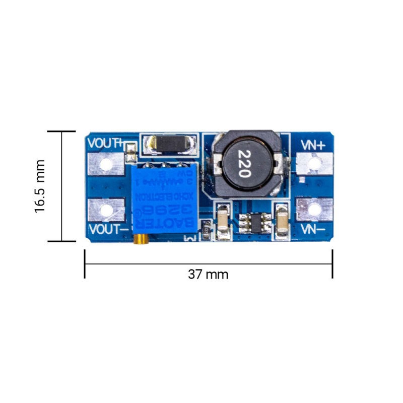 ماژول تقویت کننده ولتاژ DC MT3608 با حداکثر جریان 2 آمپر، ولتاژ دریافتی را به صورت تقویت شده در خروجی ارائه میدهد. این ماژول به شما این امکان را میدهد که ولتاژ خروجی را به سادگی و با استفاده از مولتیترن موجود روی ماژول تنظیم کنید. با توجه به اینکه نحوه کارکرد این تراشه با دیگر تراشههای افزاینده متفاوت است، در هنگام اعمال ولتاژ ورودی، محدوده قابل تغییر مولتیترن نیز متغیر خواهد بود. به عنوان مثال، با ولتاژ ورودی 5 ولت، چرخش مولتیترن به میزان 30 درصد میتواند به افزایش ولتاژ منجر شود، در حالی که با افزایش ولتاژ ورودی، این محدوده کاهش یافته و برای ولتاژهای نزدیک به سقف خروجی، نیاز به چرخش کمتری خواهد بود.