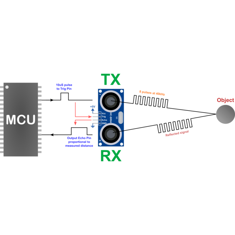 ماژول HC-SR04 یکی از پرکاربردترین ماژولهای اولتراسونیک سنجش فاصله در دنیای الکترونیک و رباتیک است که بر اساس فناوری SONAR طراحی شده و قابلیت اندازهگیری فاصله بهصورت غیرتماسی را با دقت بالا فراهم میکند. این ماژول متشکل از یک فرستنده و یک گیرنده امواج اولتراسونیک با فرکانس ۴۰ کیلوهرتز است. عملکرد ماژول به این صورت است که با اعمال یک پالس دیجیتال به پایه Trig، فرستنده شروع به ارسال امواج صوتی میکند. پس از برخورد موج به مانع، بازتاب آن توسط گیرنده دریافت شده و زمان بین ارسال و دریافت پالس توسط خروجی Echo گزارش میشود. با توجه به سرعت صوت در هوا، میتوان فاصله دقیق مانع را محاسبه کرد.