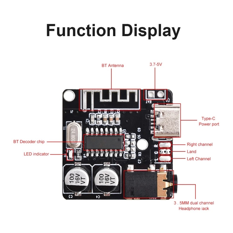 ماژول بلوتوث صوتی با قابلیت پشتیبانی از MP3, WAV, FLAC و تغذیه از باتری لیتیومی با پورت USB Type-C دارای خروجی AUX
