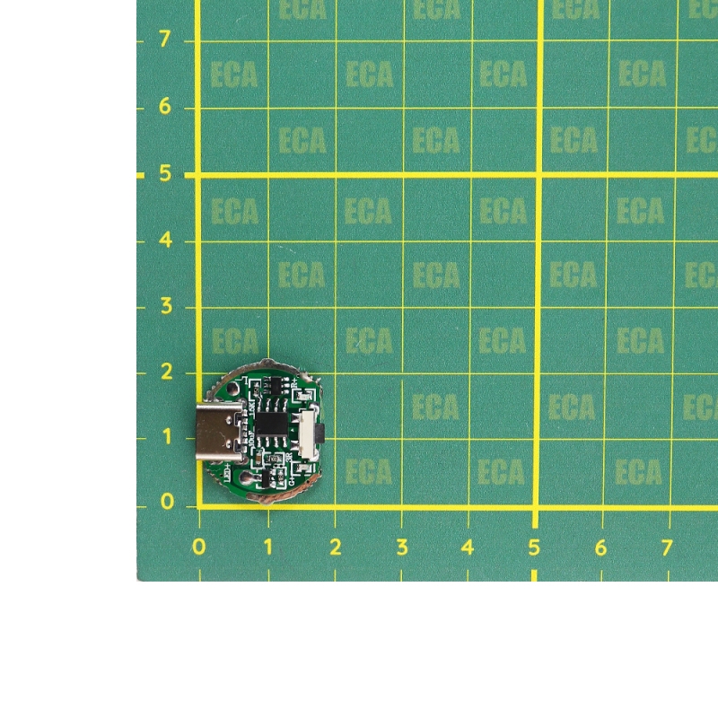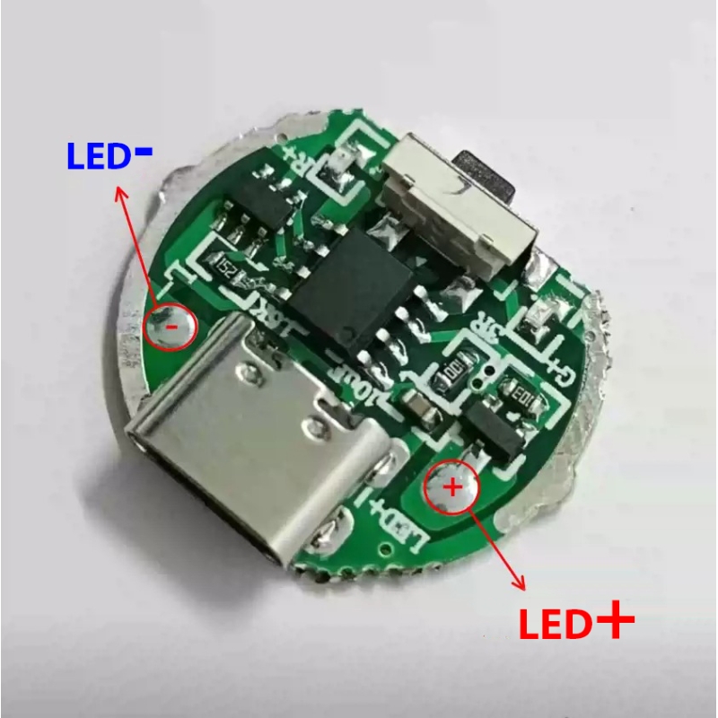 ورودی ولتاژ از پدهای دایره ای در زیر برد می باشد و خروجی طبق شکل زیر از پد های LED+ و LED- مشخص شده می باشد . برای اتصال شارژ باتری نیز می توانید از ورودی USB Type-C استفاده نمایید .