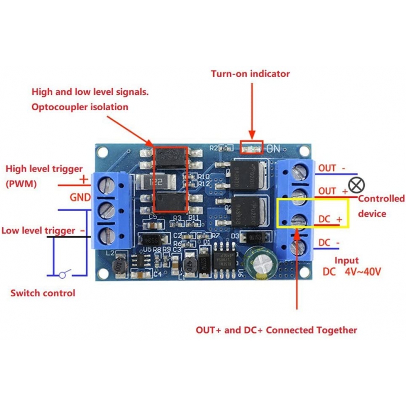 DC3.0V-24V, the trigger signal is at 3.0V-24V, and the MOS transistor is turned on;