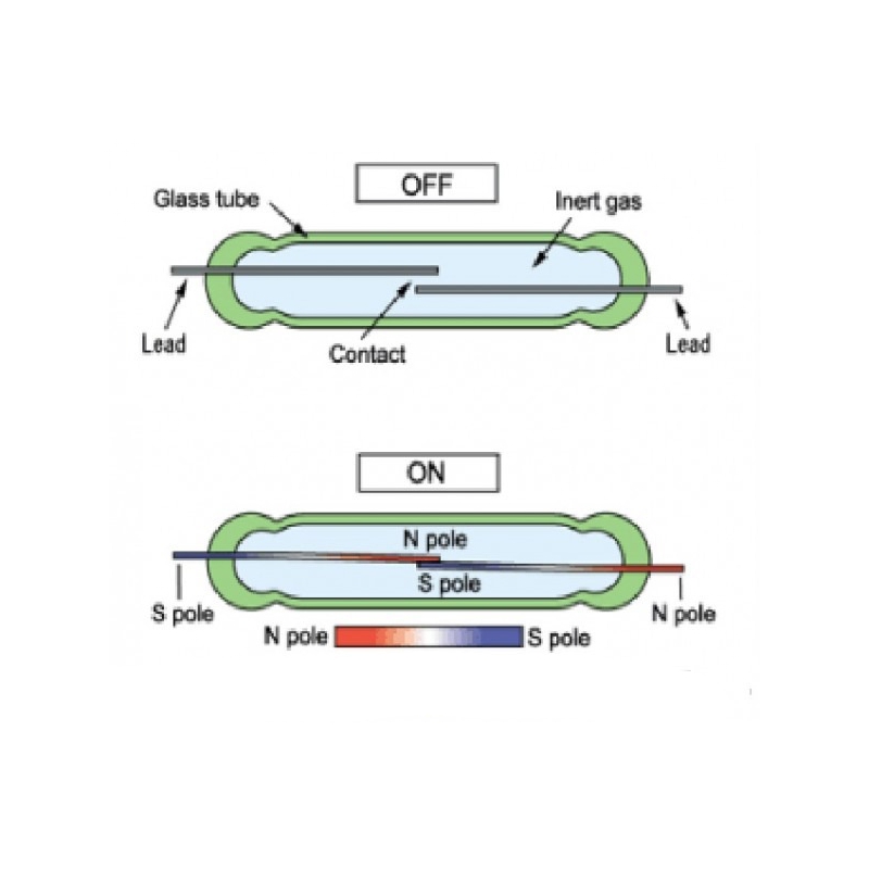 This module uses a reed relay, inside the glass bubble of this part, rhodium gas is used, which is an inert gas. When this module approaches a magnetic field, under the influence of this magnetic field, the two internal metal tongues collide. are attracted and the digital pin becomes low and after the removal of the external magnetic field, the two tabs are separated due to elasticity, and in this way, this module can be used as a signal for control.