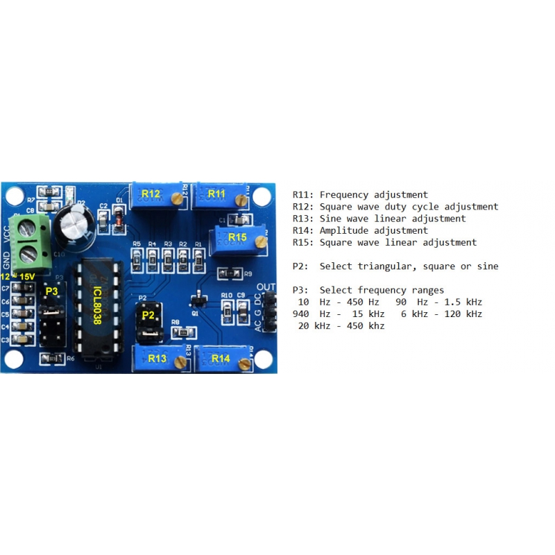 مهمترین دستگاه در تست تجهیزات الکترونیک فانکشن یا سیگنال ژنراتور (signal generator) می باشد. فانکشن ژنراتور یک تولید کننده سیگنال یا شکل موج مانند سینوسی، مربعی، مثلثی و… با دامنه و فرکانس های مختلف می باشد.ماژول LC ICL8038 برای محدوده فرکانس های رایج طراحی شده است. از 5 دنده قابل تنظیم است و امواج مثلثی با اعوجاج کم، امواج مربعی و سینوسی از 10 هرتز تا 450 کیلوهرتز تولید می کند. موج سینوسی را می توان برای سیگنال های تست، سیگنال های درایو، سیگنال های فرکانس حامل و غیره استفاده کرد. موج مربعی را می توان برای سوئیچینگ سیگنال ها، سیگنال های ماشه و غیره استفاده کرد. موج مثلثی عمدتاً برای اسکن سیگنال ها استفاده می شود.