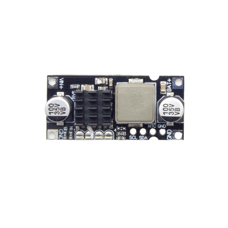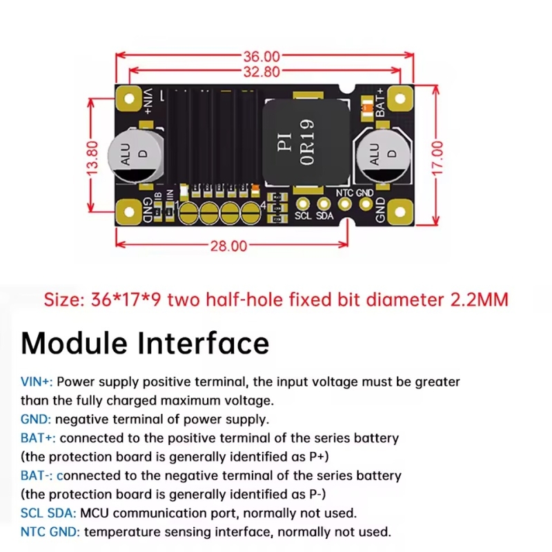 در تصویر همچنین نحوه اتصال ورودی ماژول (VIN+ و GND) و خروجی آن به باتری (BAT+ و BAT-) مشخص شده است. یک پورت برای NTC (تشخیص دمای باتری) و یک رابط I²C نیز وجود دارد که بهطور پیشفرض غیرفعال هستند و در مصارف عمومی نیازی به آنها نیست.