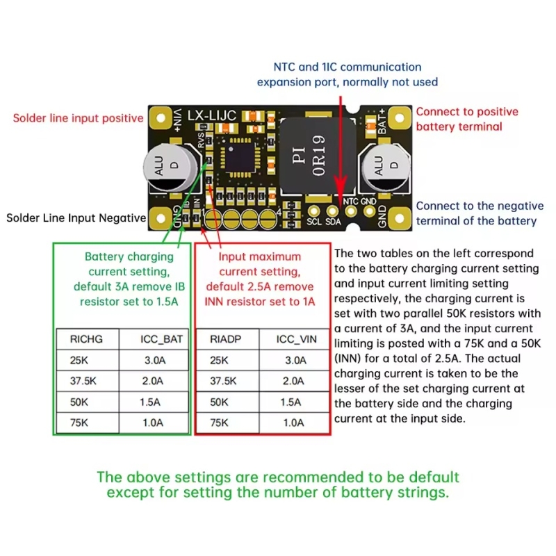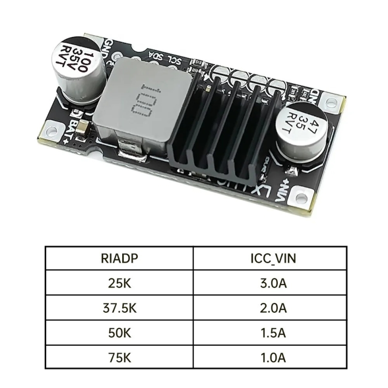 این تصویر نحوه تنظیم جریان شارژ باتری و همچنین محدودکننده جریان ورودی به ماژول را نمایش میدهد. در سمت چپ، جدول سبز رنگ مربوط به تنظیم جریان شارژ باتری است که از طریق مقاومت خارجی (با مقدار مشخص) انجام میشود. مقدار پیشفرض 3 آمپر است که با استفاده از مقاومت 25K تعیین میشود، اما میتوان با جایگزینی مقاومت با مقدار بیشتر، جریان را به 2 آمپر، 1.5 آمپر یا 1 آمپر کاهش داد. به همین صورت، در سمت راست (جدول قرمز)، تنظیم محدودکننده جریان ورودی ماژول از طریق مقاومت جداگانهای به نام INN انجام میشود که مقدار پیشفرض آن 2.5 آمپر است. اگر منبع تغذیه توان محدودی دارد، میتوان این جریان را کاهش داد تا از فشار بیش از حد به ورودی جلوگیری شود. لازم به ذکر است که جریان نهایی شارژ باتری توسط مقدار کمتر از این دو جریان (شارژ و ورودی) تعیین میشود.