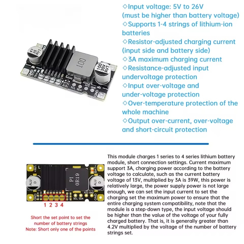 این ماژول یک شارژر حرفهای برای باتریهای لیتیوم یون یا لیتیوم پلیمر با پیکربندی 1 تا 4 سلول (1S تا 4S) است که از ساختار مبدل کاهنده ولتاژ (Buck Converter) بهره میبرد. ولتاژ ورودی قابل پشتیبانی آن از 5 تا 26 ولت DC است، به شرطی که همواره بیشتر از ولتاژ نهایی شارژ باتری باشد (برای مثال حداقل 17 ولت برای شارژ باتری 4 سل). از طریق اتصال کوتاه یکی از چهار پد تنظیم روی برد، تعداد سلولها تعیین میشود و خروجی بهصورت خودکار به ولتاژ مناسب هر سلول (تا حداکثر 4.2 ولت برای هر سلول) تنظیم میگردد.