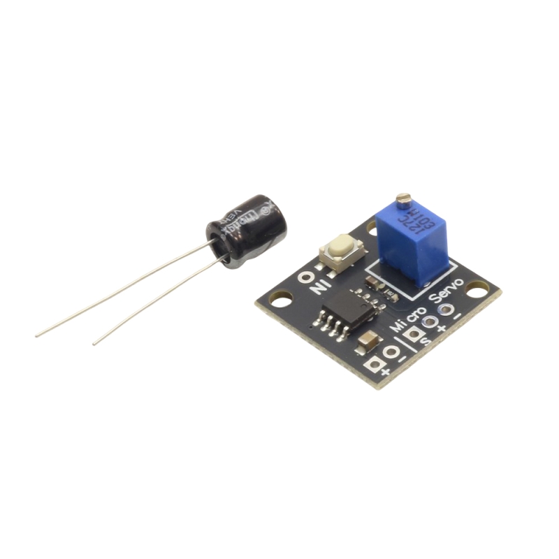 همراه ماژول یک خازن الکترولیتی 220 میکروفاراد نیز ارائه میشود که وظیفه آن تثبیت ولتاژ و کاهش نویز است. این خازن در مسیر تغذیه سروو بهصورت موازی قرار میگیرد و نقش ذخیرهسازی انرژی برای جبران پالسهای لحظهای جریان، کاهش نوسانات و جلوگیری از ریست میکروکنترلر، و پایدارسازی ولتاژ در مسیرهای بلند یا تغذیههای محدود را ایفا میکند. این طراحی باعث افزایش پایداری و عملکرد مطمئنتر ماژول در انواع شرایط تغذیه و سرووهای مختلف میشود.