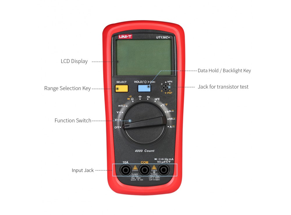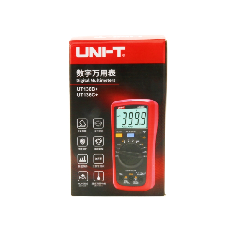 The new generation of UT136+ series digital multimeter has an innovative industrial design which ensures that the product can withstand a drop of 2 meters height. Large LCD screen provides a clear display and its 4 times/second sampling rate provides users with more accurate readings. UT136+ series is designed to work safely in CAT II1000V/CAT III 600V environment.