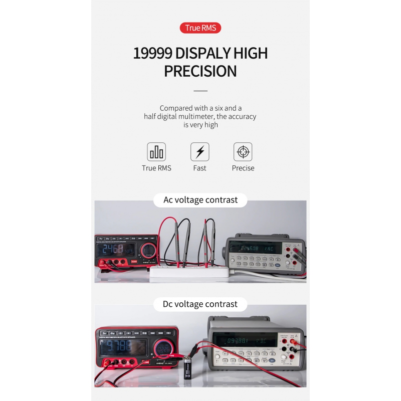 این مولتیمتر با قابلیت اندازهگیری در حالتهای خودکار و دستی، دقت شمارش تا 19999 و نمایش دقیقتری از مقادیر اعشاری ارائه میدهد که نشانهای از دقت بالای آن است. یکی از ویژگیهای برجسته این مدل، توانایی اندازهگیری مقاومتها تا محدوده 200 مگا اهم است که آن را از سایر مولتیمترهای بازار متمایز میکند.